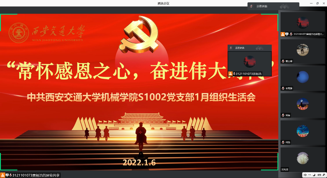 本次线上会议由支部书记雷杨浩同志主持,他提到,面对本次疫情学校学院反应灵敏,迅速部署,给我们居家学习工作创造了良好条件;后勤人员牺牲小我,在疫情肆虐的时刻仍坚守在工作岗位,给我们提供生活保障;医务工作者顶着严寒,在恶劣的工作条件下坚持工作;志愿者,尤其是党员先锋队给大家服务;全国各地的物资支援也及时送到了我们的手中。因此,我们要常怀感恩之心,感谢所有甘于奉献的工作人员。