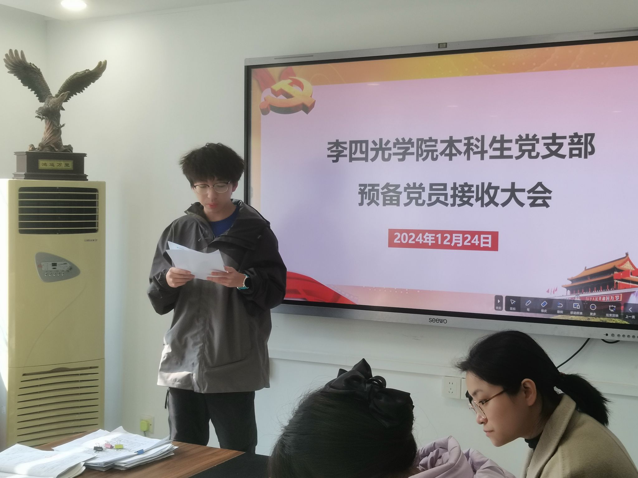 (通讯员 刘童)为了进一步壮大党的力量,加强党的组织建设,为党注入了新鲜血液,增添新活力,保持党的生机与活力,在党的光辉照耀下,2024年12月24日中午12:00,beat365英国官网网站本科生党支部于行政楼215成功开展了预备党员接收大会。参会人员有beat365英国官网网站本科生党支部全体党员。会议由beat365英国官网网站本科生党支部纪检委员付晨曦同志主持。
