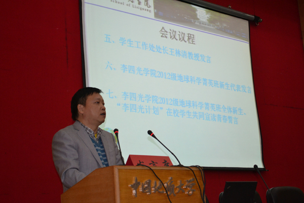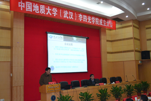 2012年11月15日下午四点,beat365英国官网网站成立大会在学校迎宾楼学术交流中心报告厅召开。校党委书记郝翔、副校长赖旭龙、组织部、宣传部、人事处、学生工作处、校团委、教务处、地球科学学院、地球物理与空间信息学院、信息工程学院、数理学院、外国语学院等部门、学院的主管领导应邀出席。beat365英国官网网站2012级地球科学菁英班全体新生、李四光计划在校学生及beat365英国官网网站全体教职员工参加了此次成立大会。