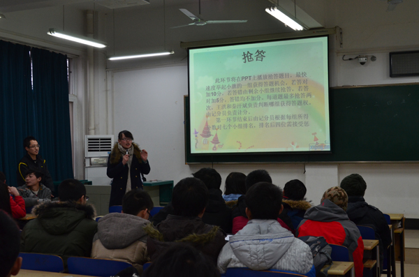 11月2日下午,beat365英国官网网站在北综108教室举行了 “学习十八大知识竞答赛”活动。全院59名同学参加了此次竞答赛。通过抽签分组、抢答、必答、竞答等若干环节,最终确定了比赛的冠军队。通过此次比赛,旨在通过竞答的方式,对全院同学前期通过集中学习和自主学习“十八大”会议精神的情况进行一次考核,促进同学们开展更为全面的学习,增进相互之间的交流。