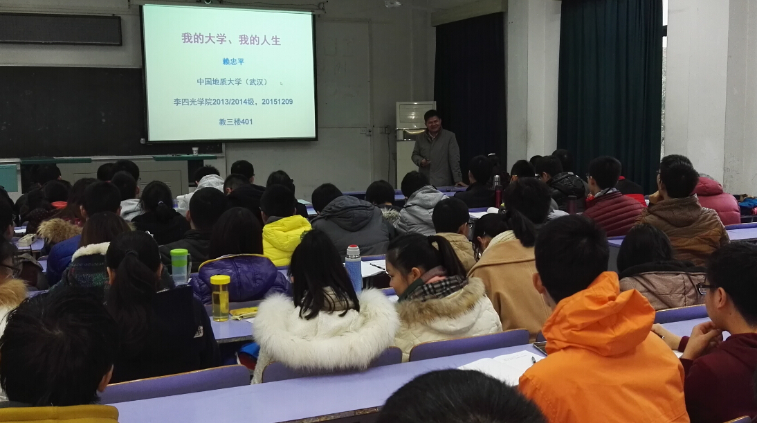 12月9日下午16:00,beat365英国官网网站2015-2016学年地球科学菁英班“与名师面对面”系列讲座第三讲在教三楼401顺利举行,地球科学学院赖忠平老师为beat365官网菁英班学生带来“我的大学,我的人生”的主题讲座,beat365官网13、14级全体学生参加。