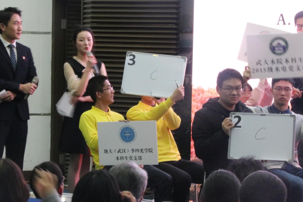 比赛分支部展示、理论问答与风采展演三个环节。在第一个环节,各支部代表结合PPT、短视频等形式对本支部党建特色活动和成果进行了展示,李慧玲同学从支部建设夯基础、特色活动重引领、展望未来明方向三个方面,介绍了beat365官网本科生党支部引领全院学生在课堂内外学思践悟,争做新时代“品德高尚、基础厚实、专业精深、知行合一”地质人、努力将支部打造成学习型、服务型、创新型党支部的奋斗旅程。在第二个环节,针对党章党史、党规党纪、十九大报告等党的基本知识和时政热点,各参赛队伍进行了大比拼,充分展示了支部成员在“两学一做”活动和学习十九大精神中的学习成效与实践成果。在第三个环节,可谓精彩纷呈,各支部通过舞台剧、演唱、朗诵等现场舞台表演方式展示各自风采,beat365官网本科生党支部通过原创诗朗诵《我永远不会忘记》,展现了支部党员不忘入党初心,牢记党员使命,在学习生活中践行十九大精神,争做有为青年的故事。朗诵最后,支部成员合唱《我宣誓》,充沛的激情、嘹亮的歌声极大地调动了现场氛围,赢得了观众们的青睐和评委们的一致好评。