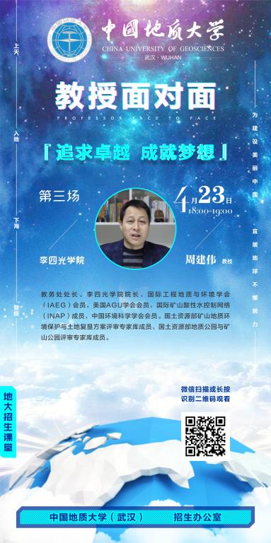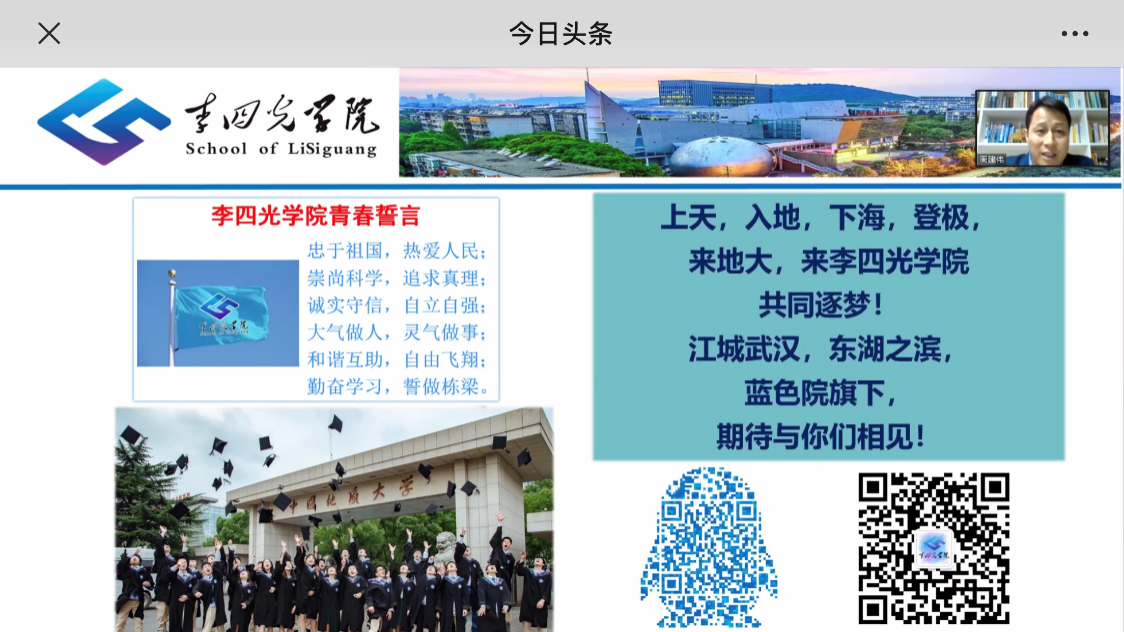 2020年4月23日晚18:00,beat365英国官网网站院长周建伟教授连线今日头条直播间,以“追求卓越 成就梦想”为题,带领广大考生和家长共同走进这所以著名地质学家李四光先生命名的荣誉学院。