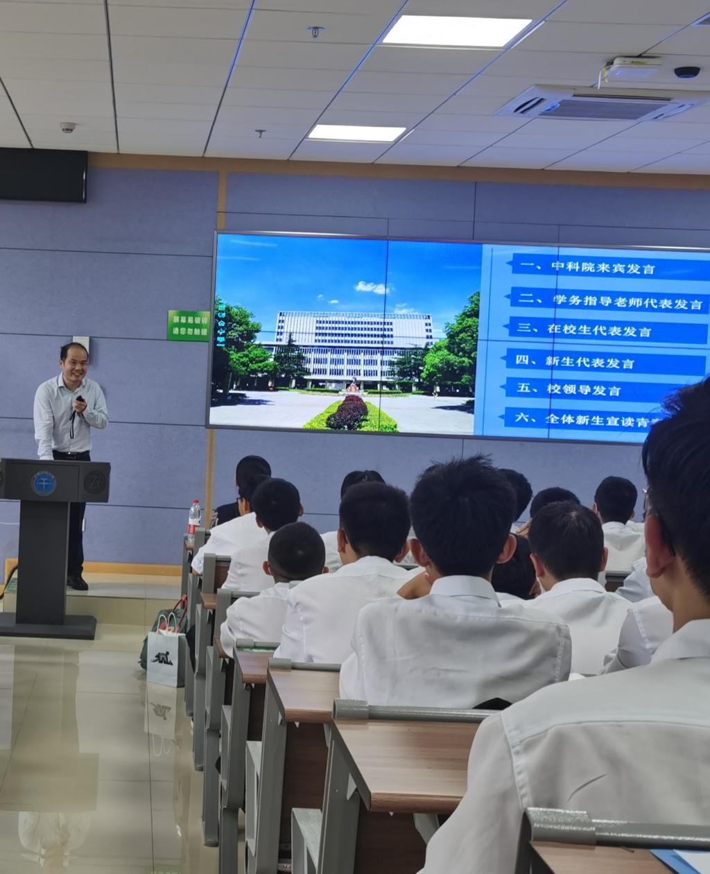 中科院精密测量科学与技术创新研究院副院长倪四道研究员首先代表联合培养中科院所发言。倪四道研究员以“时代”为主题,从精密测量研究角度,为学子们展现了一个充满了机遇与挑战的时代,并以此激励新生充分利用联合培养学习资源,努力学习各种知识,拓宽视野,提升素养,未来必将是大有可为。