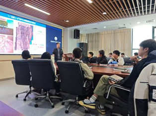 在参观完实验室之后,同学们进一步移步会议室,聆听了王力博士生的研究报告。报告中,王力博士对日喀则蛇绿岩中地幔纯橄岩的形成做出了科学合理的推断,并用多种证据证明了推断的合理性,从而得到更具有说服力的结论。在这一思辨过程中,同学们不仅感受到科学研究的严谨性,还更加全面地了解实验室的科研水平以及地学的前沿知识。报告最后,王力博士和研究生们还分享了他们的学习、科研和工作经历。