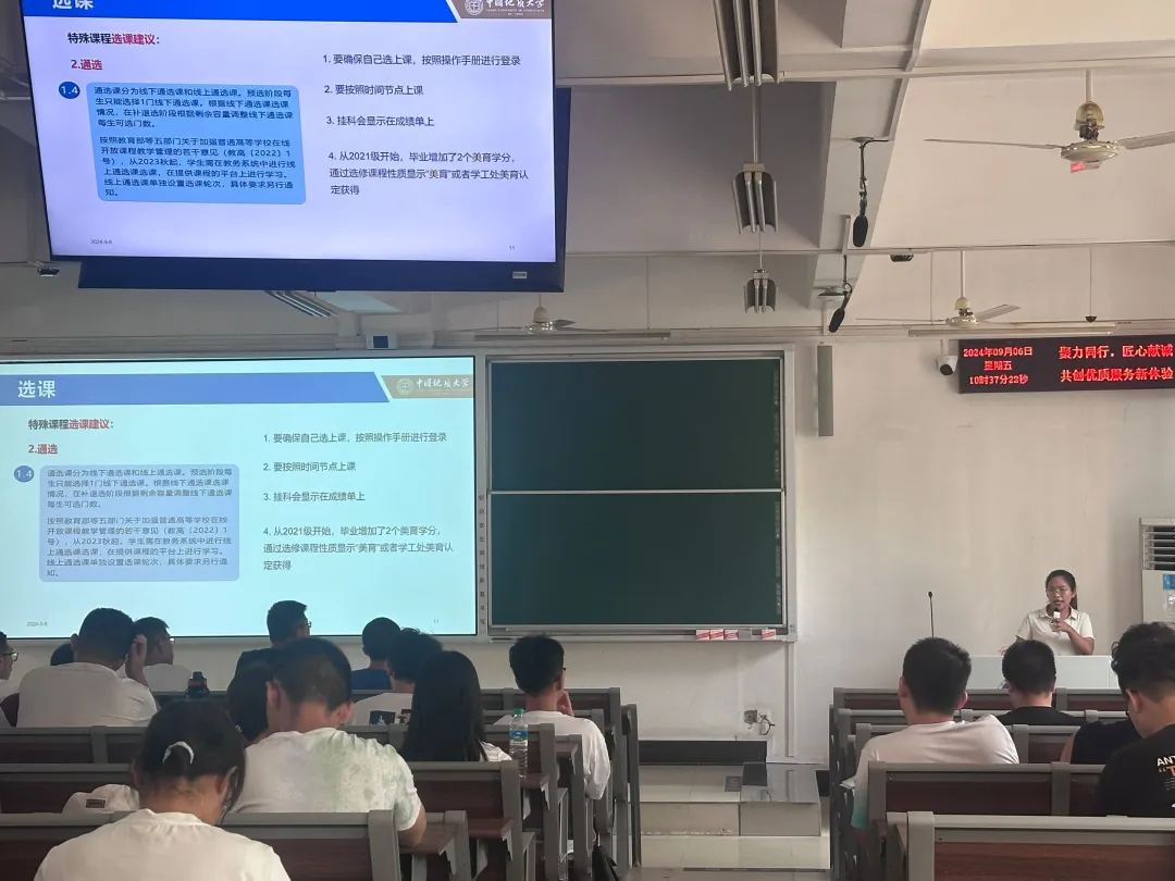 刘庆生老师发言结束后,beat365官网教学秘书马丽敏老师及大三遥感专业黄昊龙学长随即为同学们提供了关于选课指导和教学方案计划的详细解读。