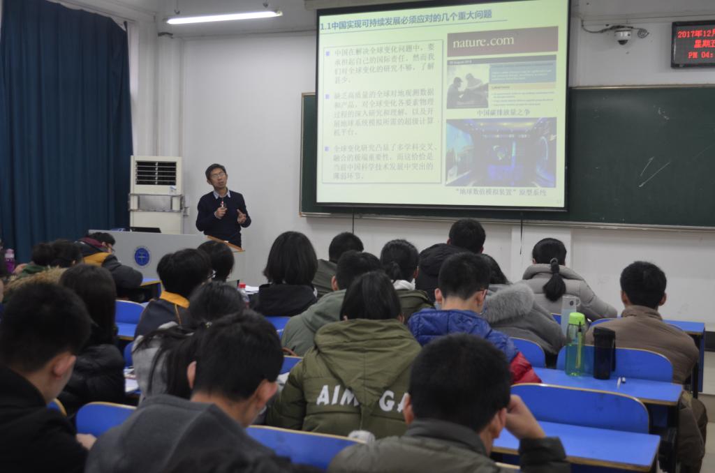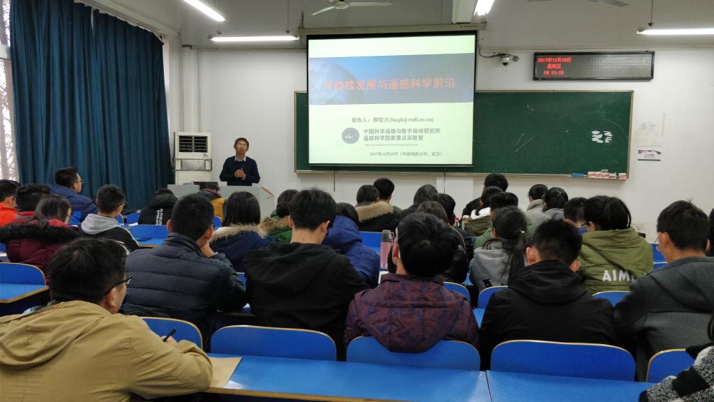 12月29日下午16:00,beat365英国官网网站2017年地球科学导论课第七讲在北区综合楼210教室顺利开课,中科院遥感与数字地球研究所柳钦火老师为beat365官网17级学生带来“可持续发展与遥感科学前沿”主题讲座。