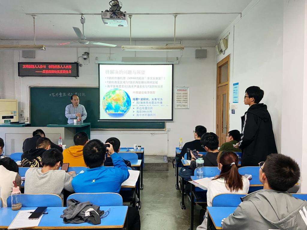 接着, 倪老师主要向同学们介绍地震T波的含义和作用。海洋地震在固体地球中激发出弹性波(包括P波、S波),其中一部分弹性波在海底转化为海水中的声波,经海洋声道(SOFAR)向远处传播,水声波可以再次转换为在固体地球中传播的弹性波,形成地震T波震相。T波主要在海洋声道中传播,具有衰减小、传播距离远的特点,在一些低震级地震的检测和地壳衰减(Q)结构以及物理海洋学研究中都有很重要的应用,是目前地震学研究的前沿热点。
