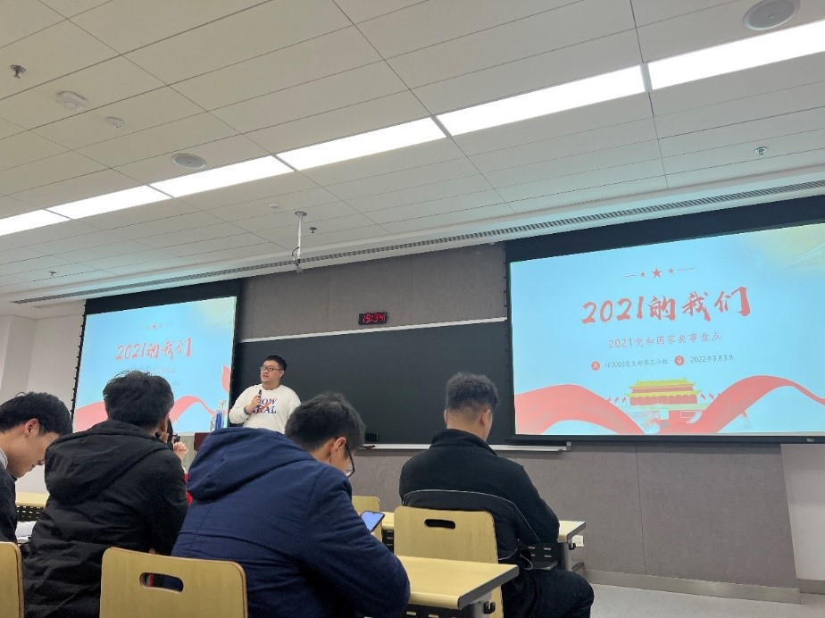 首先党小组组长程奕炜同志介绍2021年党和国家要事,包括《民法典》颁布、脱贫攻坚表彰大会、建党百年庆祝大会等等,本次生活会分为五个部分:《民法典》——社会生活的百科全书、脱贫攻坚我们在路上、总书记在庆祝建党100周年大会重要讲话、筑梦苍穹——神舟十三号出征太空和文艺与时代同频共振。