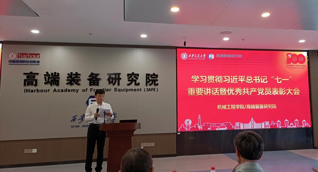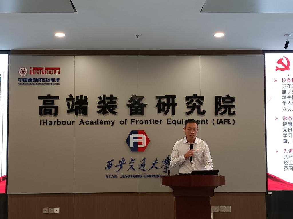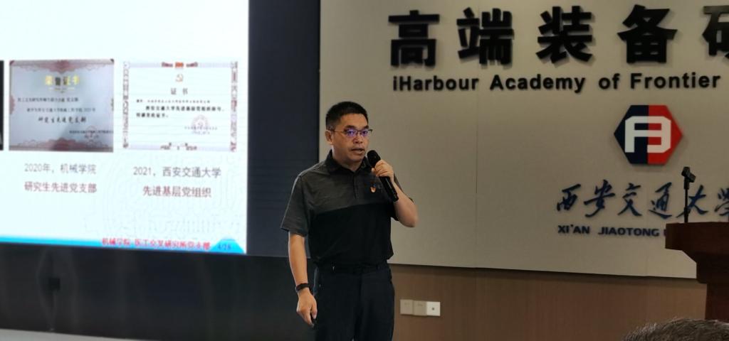 教职工优秀党员、创新港青年先锋代表黄军辉老师进行了发言。他汇报了新能源装备与质量工程研究所的前期建设,同时积极响应学校学院号召和学科发展脚步,推动研究成果转化,在提升团队建设的同时,也加强了与外单位的合作交流。他表示只要不舍昼夜,奋勇拼搏,不计较个人得失,一切以集体利益为重,任何困难都可以克服,一切不可能都可以变成可能,并且他将会继续发扬西迁精神,为交大的双一流建设以及机械学科的发展贡献力量。