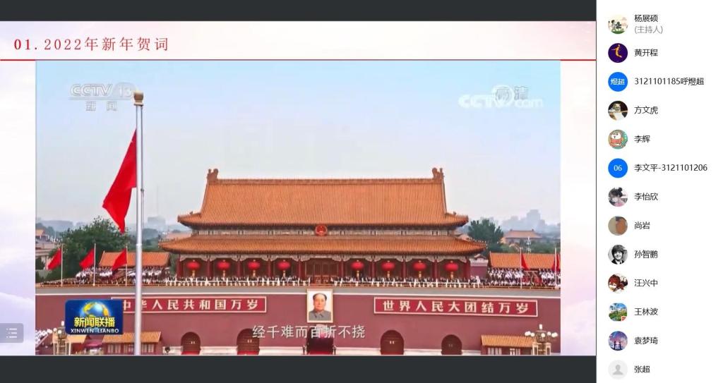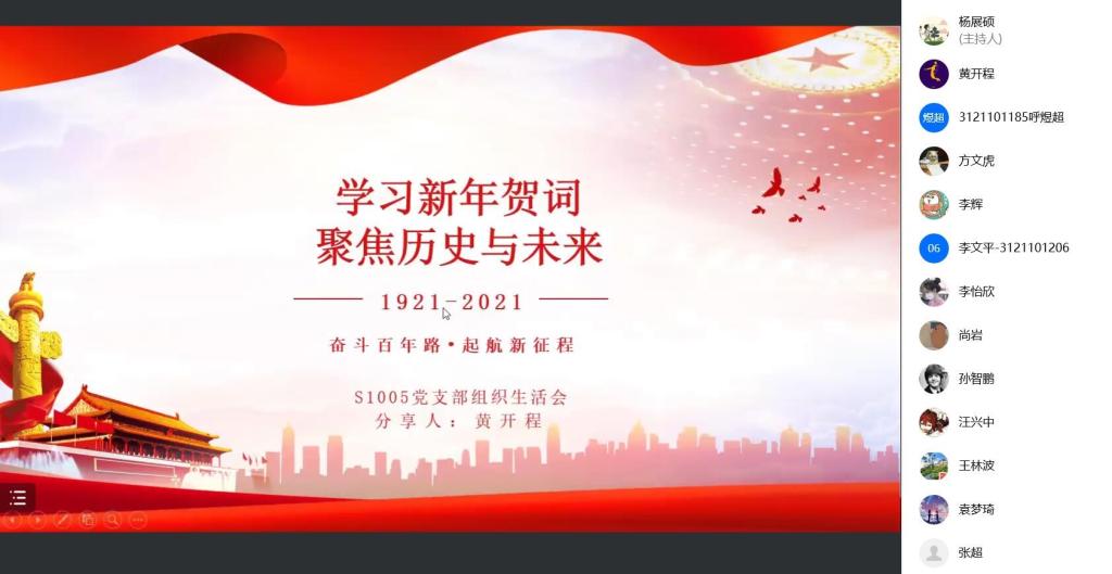组织生活会第二部分,黄开程同志带领在座党员学习了新年贺词,一同见证了祖国母亲的伟大与富强。并与同志们再次回顾了党的一百年奋斗史,一百年来,党领导人民浴血奋战、百折不挠、解放思想、锐意进取,从新民主主义革命的伟大成就到新时代中国特色社会主义的伟大成就,书写了中华民族几千年历史上最恢宏的史诗。
