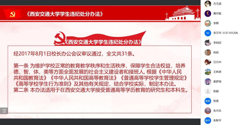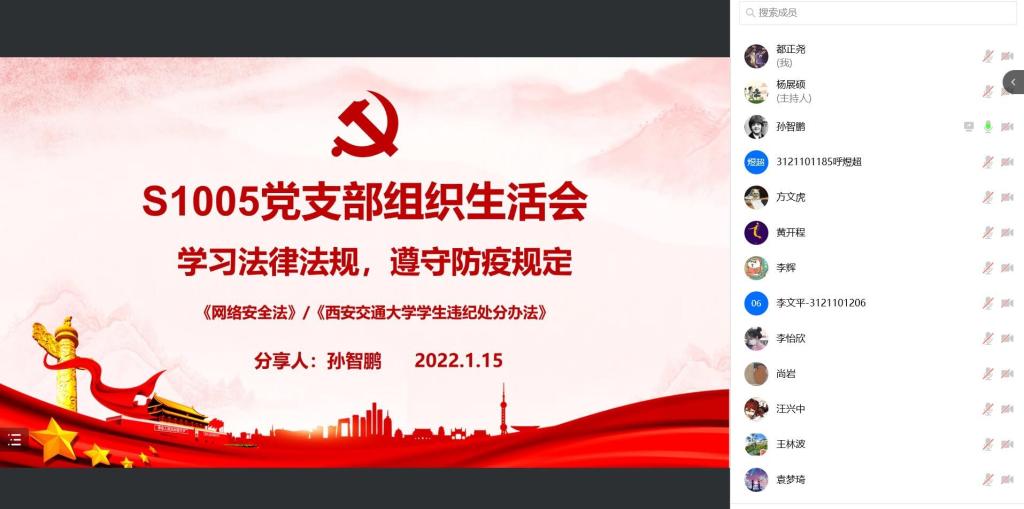 疫情就是命令,防控就是责任。疫情防控期间,遵守相关的法律规定,积极服从和配合疫情防控管理,这是公民义务更是法律责任,为加强我校学子的尊法、守法意识,硕1005党支部于2022年1月15日19:30在线上召开了“遵守防疫规定,聚焦历史未来”组织生活会。旨在学习《网络安全法》等相关法律知识,让法律意识更加深刻地扎根于青年学子心中。