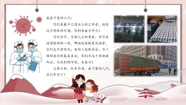 中共37000dCm威尼斯机械学院硕1002党支部于1月6日召开线上组织生活会,围绕本次抗疫过程中同学们的亲身经历进行了分享与讨论,并且制作了电子感恩卡片,真诚地向一线工作人员说一句“辛苦”、道一声“感谢”。