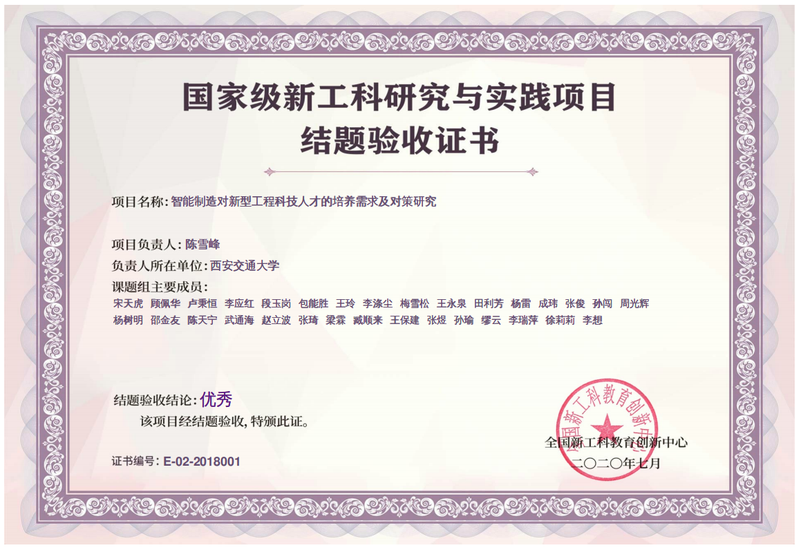 国家级新工科研究与实践项目结题验收证书(优秀)