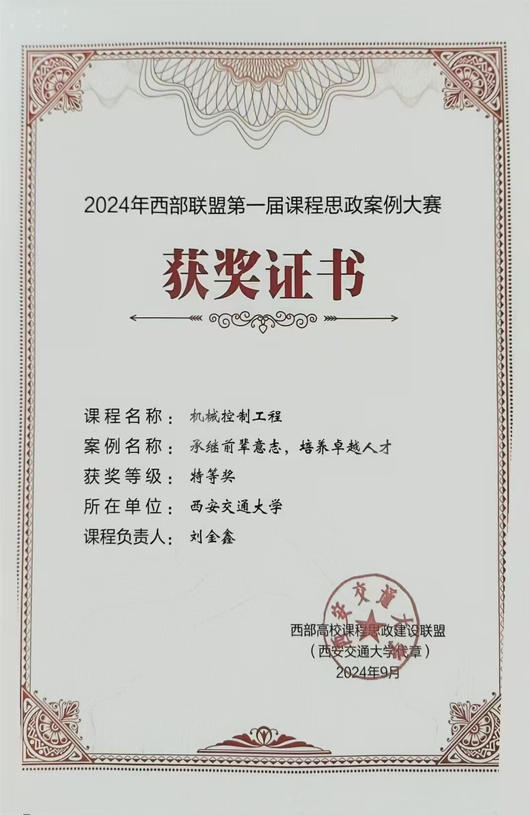 刘金鑫教授获2024年西部联盟第一届课程思政案例大赛特等奖